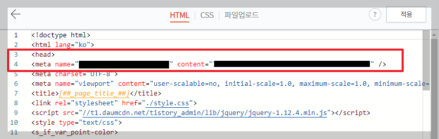 4. 스킨 편집에서 HTML 로 메타 태그 등록하기